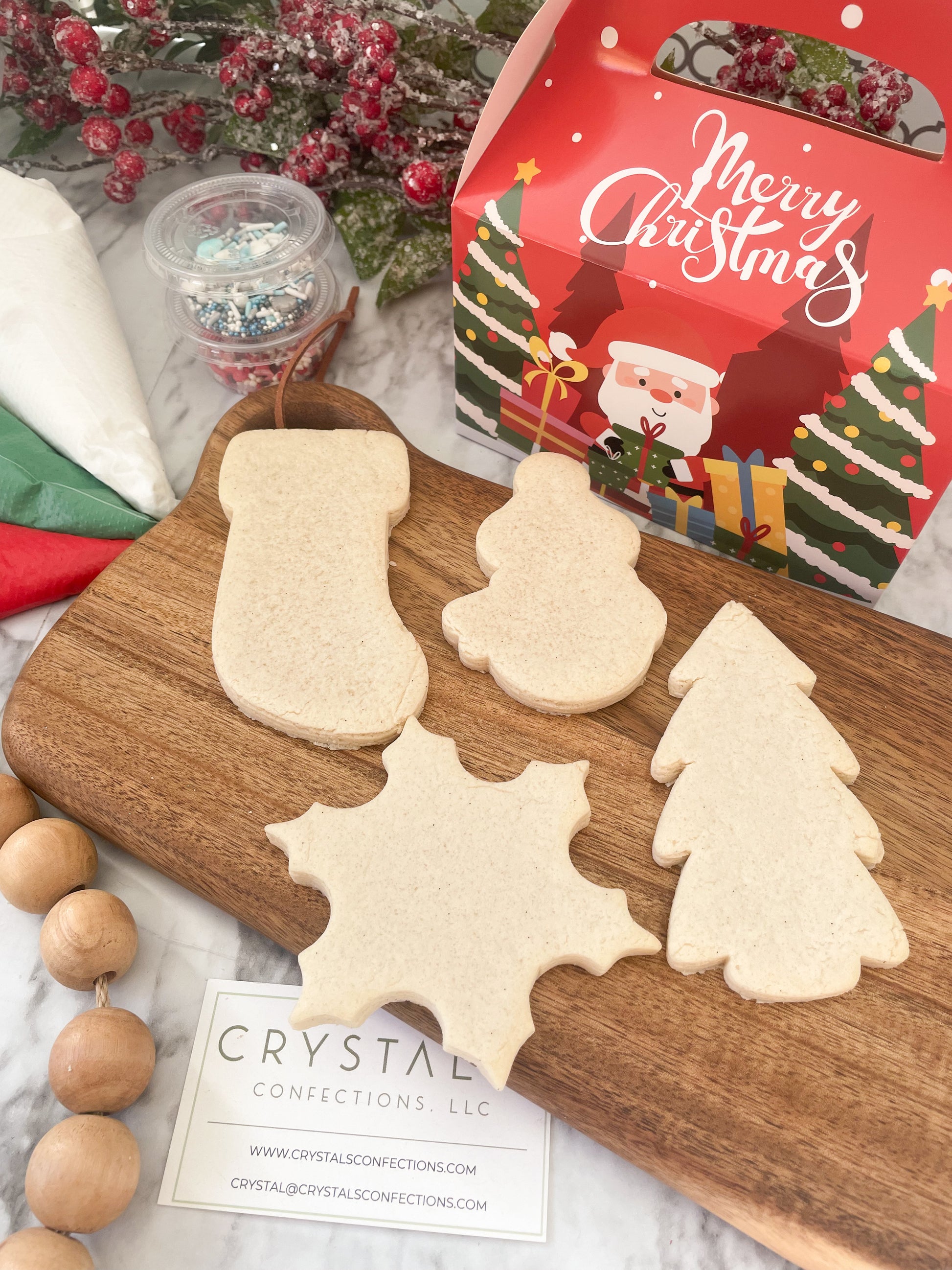 Comes with 4 sugar cookies, 3 bags of icing, 2 containers of sprinkles in a cute Christmas gable box.